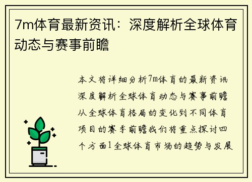 本文将详细分析7m体育的最新资讯,深度解析全球体育动态与赛事前瞻。从全球体育格局的变化到不同体育项目的赛季前瞻,我们将重点探讨四个方面:1) 全球体育市场的趋势与发展;2) 主要赛事的最新动态;3) 新兴体育项目的崛起与未来;4) 体育数据分析对赛事预测的影响。通过这些方面的探讨,本文旨在提供一个全面的视角,帮助读者更好地理解体育世界的动态,预判未来体育赛事的发展方向。